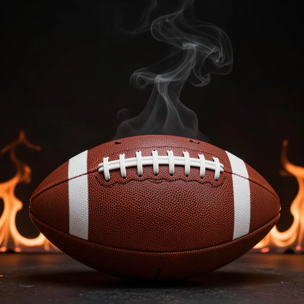 A brown leather American football, detailed with visible grain and creases, emits cool gray smoke while resting on a dark, textured surface flanked by vibrant orange flames. The low-angle, symmetrical composition with shallow depth of field and directional rim lighting emphasizes the ball's form and creates a dramatic, atmospheric still life.