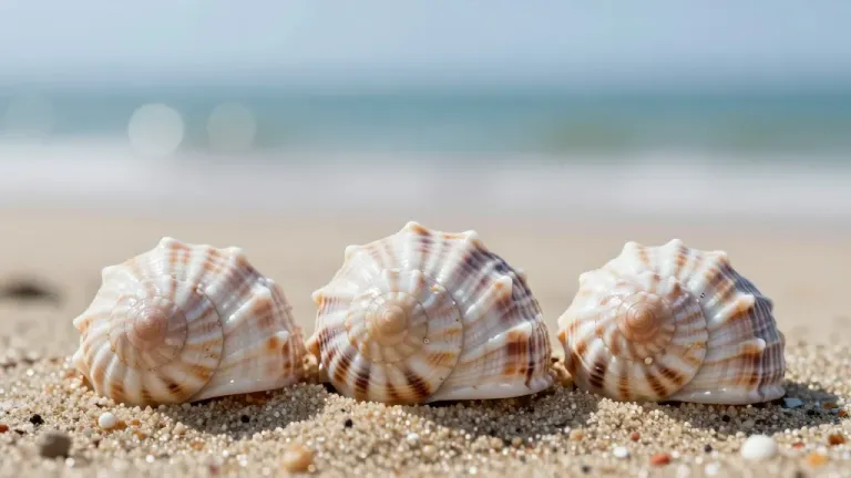 Three glossy seashells with intricate ribbed patterns rest on fine, powdery sand, bathed in warm golden sunlight. The soft blur of the ocean background enhances the serene and calming atmosphere of the scene.