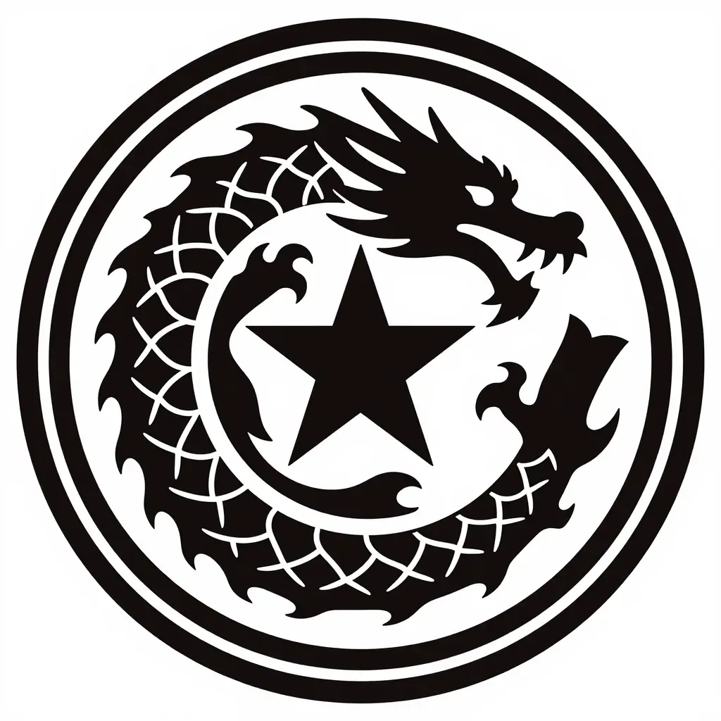 A glossy black dragon, sharp star, and eagle are intricately designed within a circular emblem, highlighted by even and direct lighting that accentuates their details and creates subtle shadows. The clean white background ensures the emblem stands out prominently, providing ample copy space for various design applications.