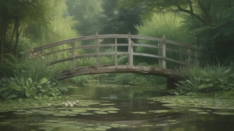 A rustic wooden bridge arches gracefully over a tranquil pond adorned with lily pads, bathed in soft morning light filtering through dense foliage. The composition draws the eye across the calm water, framed by lush greenery and vibrant flowers, creating a peaceful and inviting atmosphere.