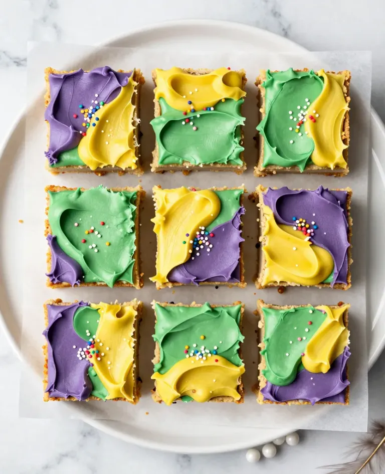 A 3x3 grid of confetti cookie bars, each frosted in vibrant primary colors and sprinkled with confetti, arranged on parchment paper under soft, diffused lighting that highlights the glossy frosting and golden-brown crust, creating a clean and symmetrical presentation ideal for culinary or food photography.
