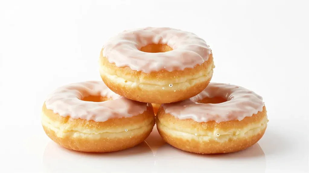 A stack of golden-brown donuts with pale pink icing, softly lit from above, creating highlights on the icing and a gentle shadow beneath the stack. The pure white background emphasizes the donuts, providing ample copy space.