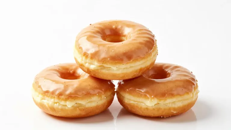 Golden-brown donuts with glossy caramel glaze stacked in a pyramid, illuminated by soft, diffused light from above, creating gentle highlights and shadows. Clean white background slightly blurred to emphasize the donuts.