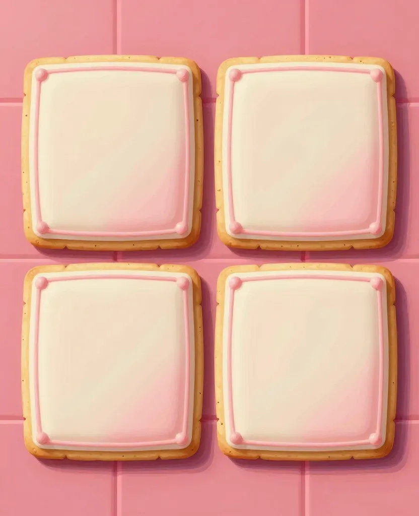 Four square iced biscuits with glossy white icing, arranged in a 2x2 grid against a vibrant pink background. Soft, diffused lighting enhances the texture and sheen of the icing, creating a balanced and symmetrical composition.