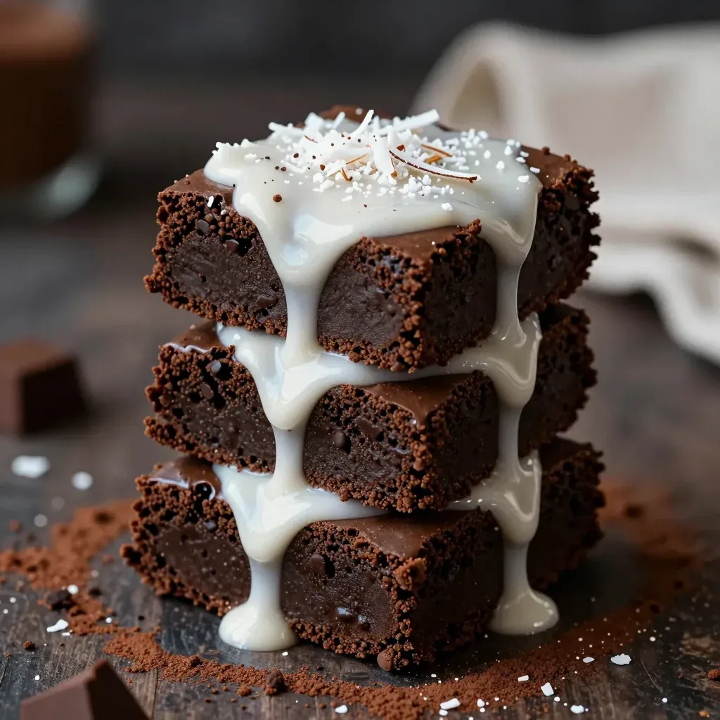 Stacked coconut-iced brownies with glossy white icing and rich chocolate texture, softly lit to highlight the glossy icing and rich chocolate, creating a cozy, homemade atmosphere with a shallow depth of field blurring the background.