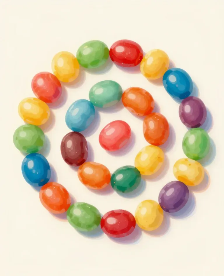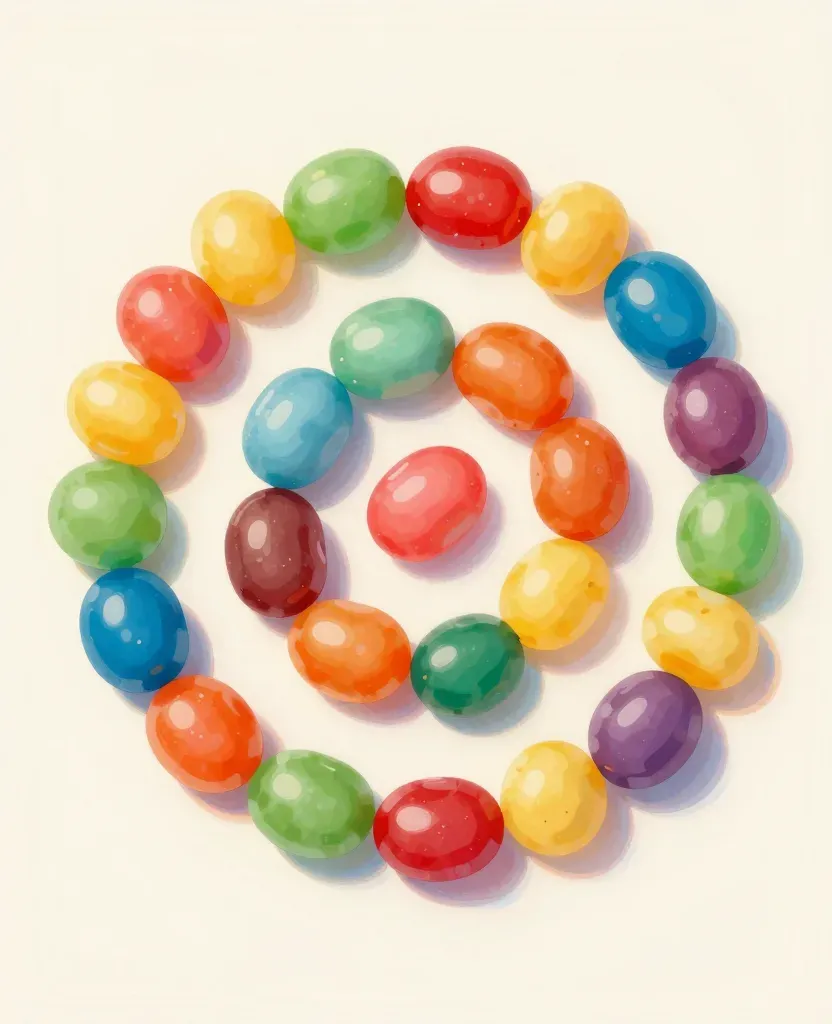 A vibrant swirl of glossy jelly beans in primary colors, illuminated by warm, directional light that highlights their reflective surfaces and creates soft shadows, set against a clean, white background with ample copy space.