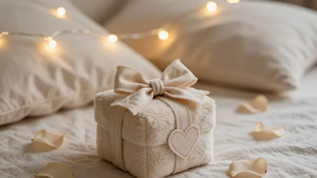 A close-up of a cream-colored bow resting on a soft, textured bed, illuminated by warm, dreamy string lights. The shallow depth of field draws attention to the bow, creating a serene and intimate setting.