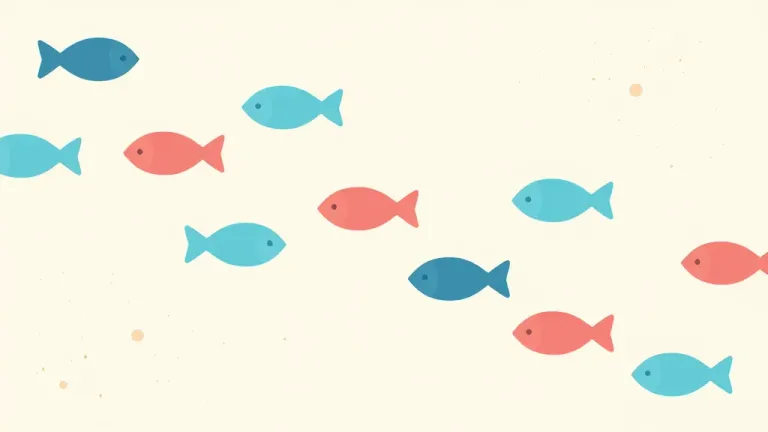 A school of blue and pink fish swims gracefully in a glossy, smooth, water-like environment under soft, overhead lighting that creates highlights and depth. The minimalistic beige background with subtle orange dots enhances the focus on the fish, offering ample copy space for design integration.