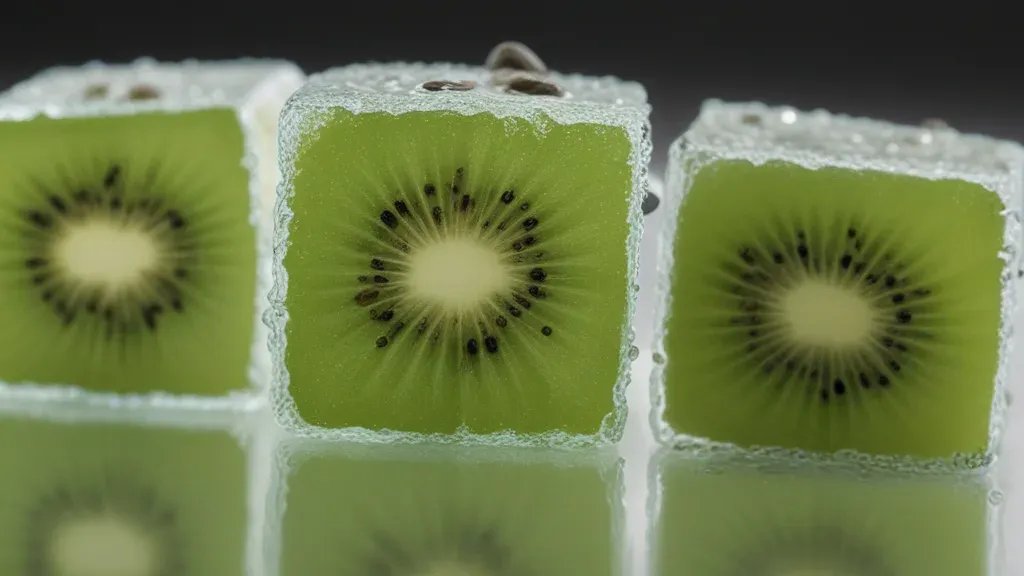 Bright green kiwi ice cubes with glossy, juicy interiors and smooth icy exteriors, highlighted by soft, diffused light from above, creating reflections and emphasizing the texture and vibrant colors against a dark, blurred background.