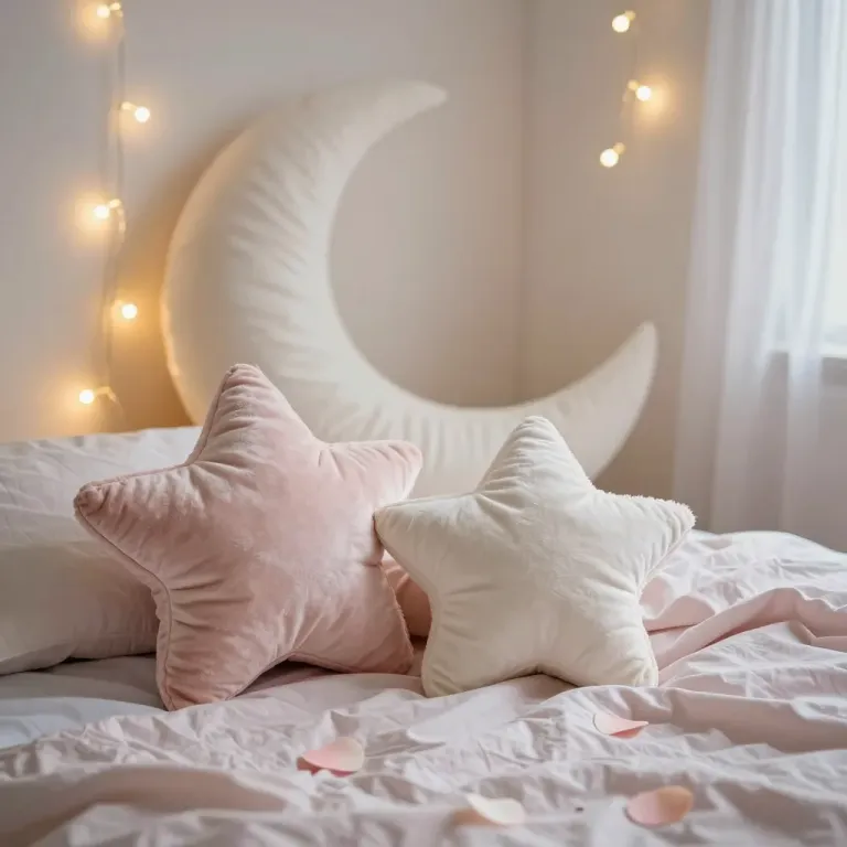 A serene bedroom scene featuring a crescent moon pillow and star-shaped pillows, bathed in warm, golden string lights. The soft, velvety fabric and light, airy bedspread create a tranquil and inviting atmosphere.