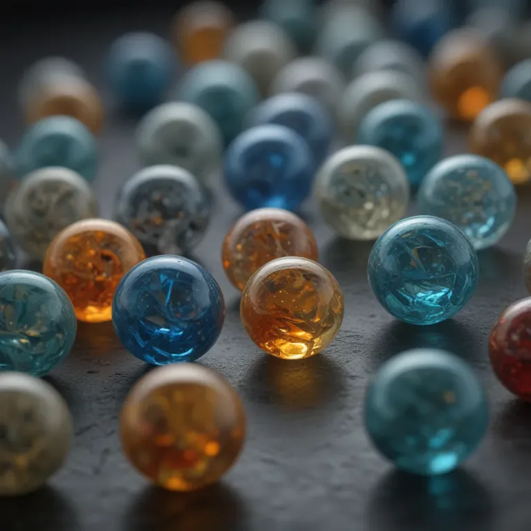 Glossy glass marbles with subtle internal patterns reflect soft, diffused light, creating a shimmering effect. The close-up, shallow depth of field emphasizes the marbles against a dark, textured background.