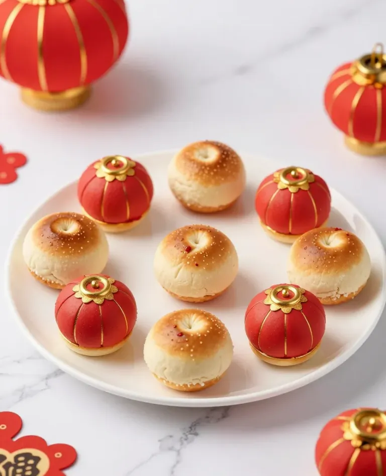 Smooth, glossy red pastries with golden detailing are arranged in a circular pattern on a white plate, creating a visually appealing composition. Soft, diffused light highlights the textures of the pastries, while a clean white marble countertop with subtle red and gold accents serves as the background, slightly blurred to keep the focus on the pastries.