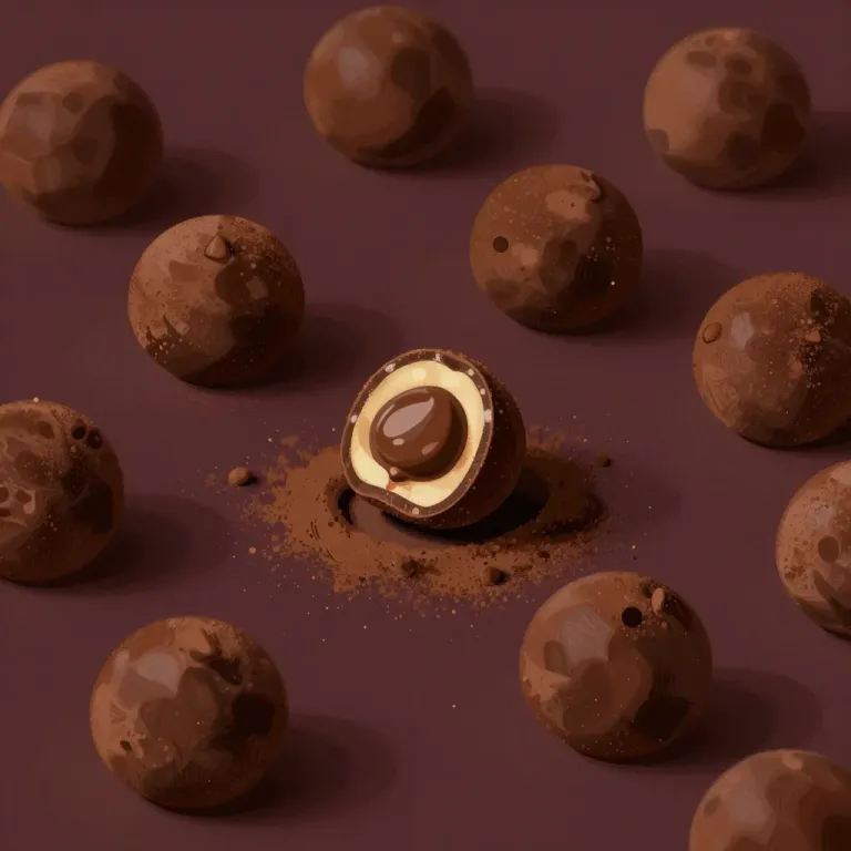 A glossy chocolate truffle with its creamy interior exposed, surrounded by other truffles in a soft, diffused light. The deep brown background provides a warm and inviting backdrop with a shallow depth of field.