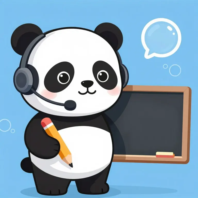 A panda wearing a headset and holding a pencil stands in front of a chalkboard, illuminated by gentle overhead light that highlights its glossy fur and soft shadows. The simple blue background keeps the focus on the panda and the chalkboard, creating a balanced and inviting scene.