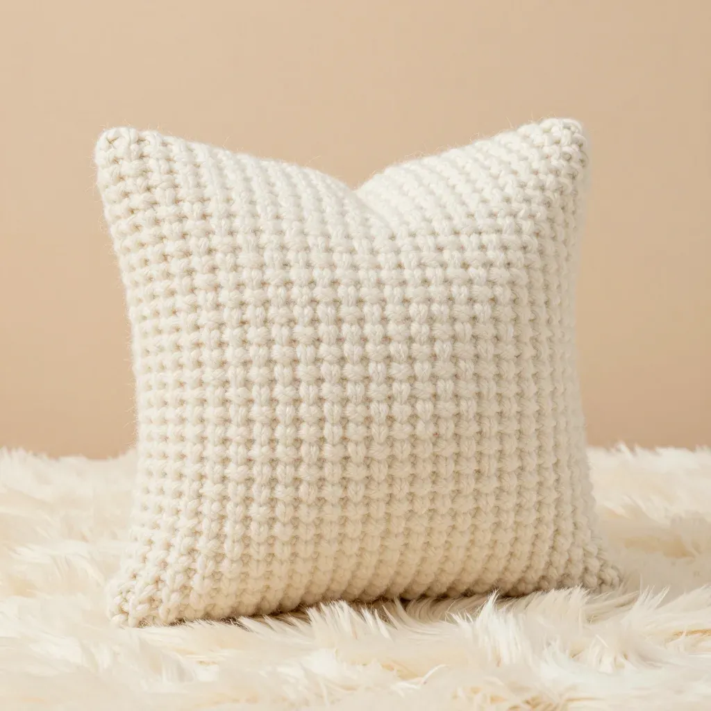 A soft, woven knit pillow with a tactile, slightly raised texture is showcased in a close-up shot, resting on a fluffy fur blanket. Diffused, soft light from above creates gentle shadows and highlights, emphasizing the pillow's texture and the blanket's plushness.