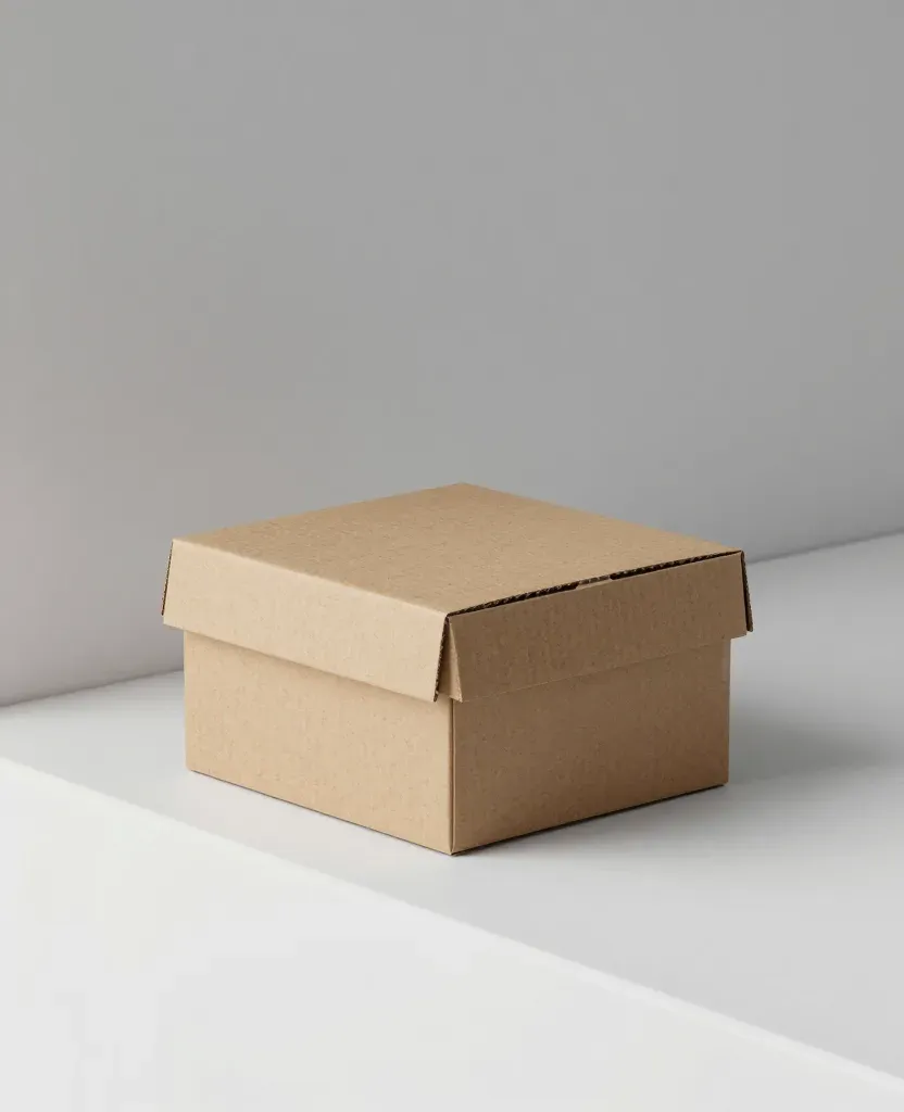 A rough, corrugated cardboard box with slightly worn edges sits on a clean white surface, illuminated by soft, diffused lighting that casts gentle shadows, creating a minimalist and neutral aesthetic.