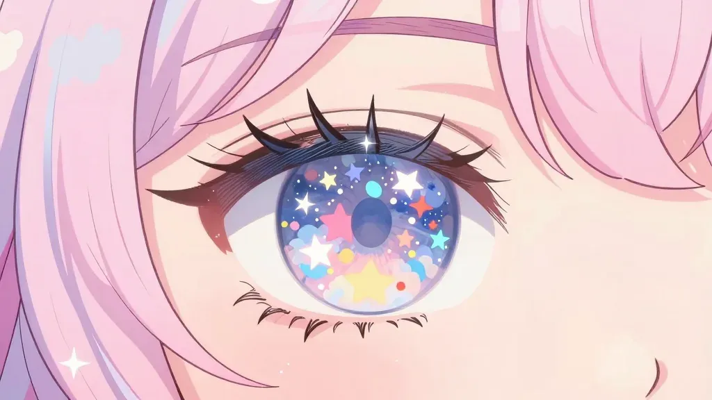 A close-up of an anime-style eye with a glossy, reflective surface, set against a soft pink and white background, creating a dreamy, ethereal atmosphere. The eye's iris is filled with deep blues and purples, adorned with white, yellow, and orange stars and planets, while the hair frames the eye with a soft, diffused light highlighting its details and texture.