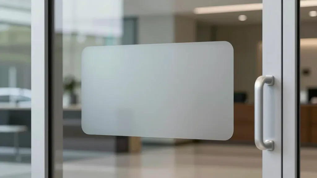 A frosted glass door with a handle, softly lit from within, creating a gentle glow and shadows, set against a blurred modern interior with furniture and decor. The balanced composition and neutral tones suggest a clean, contemporary setting.