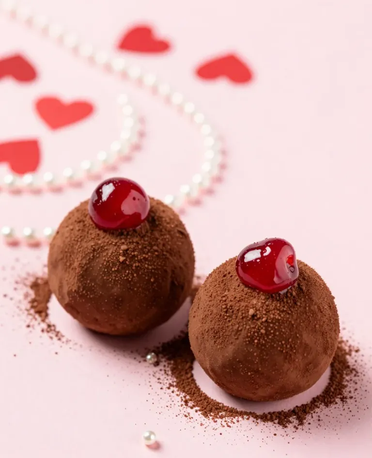 Two chocolate truffles dusted with cocoa powder and crowned with vibrant red cherries rest on a soft pink surface, surrounded by scattered hearts and pearls. The soft, diffused lighting creates gentle highlights and shallow depth of field emphasizes the truffles while blurring the background for a clean, elegant composition.