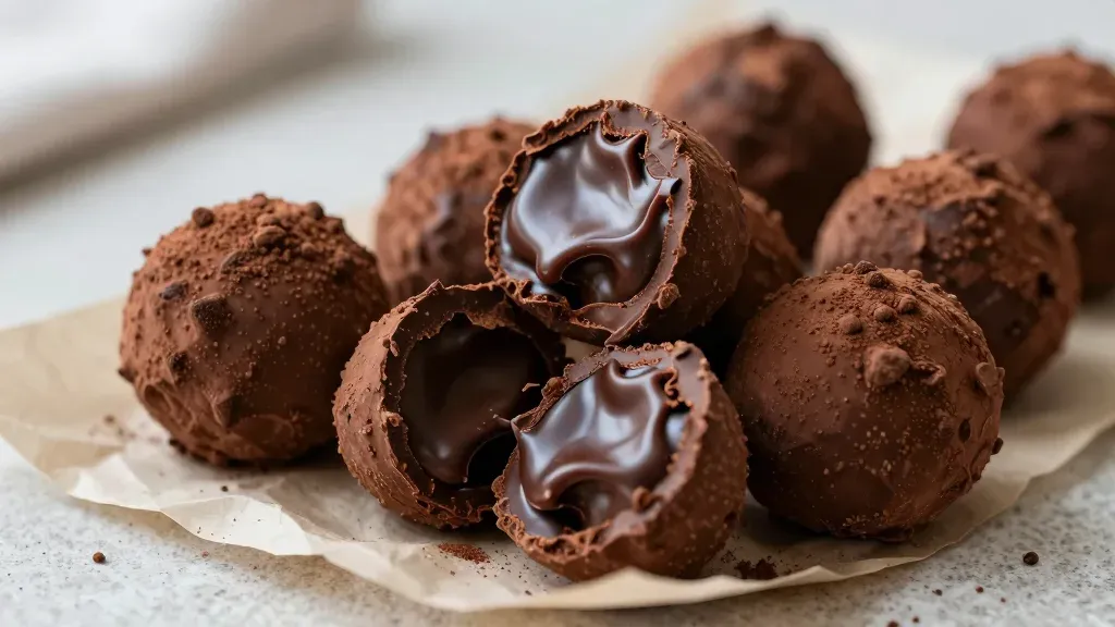 A close-up of chocolate truffles with a smooth, glossy exterior and a soft, slightly rough interior, revealing a rich, dark filling. The soft, diffused lighting highlights the texture and creates a visually appealing contrast against the white parchment paper and light-colored background.