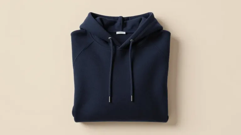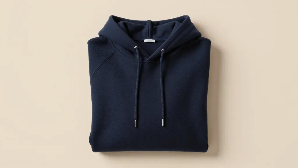 A neatly folded navy blue hoodie showcases its soft, slightly textured fabric under soft, even lighting. The neutral beige background provides a clean and unobtrusive backdrop, emphasizing the hoodie's design and details.
