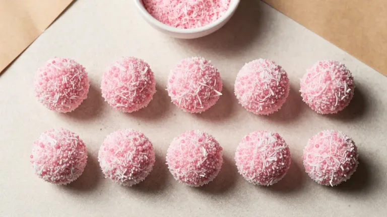 Glossy pink coconut truffle bites, coated with shredded coconut flakes, arranged on a light brown parchment paper with soft, diffused lighting that enhances their texture and depth. The neutral background ensures the focus remains on the truffles, making it ideal for culinary and food photography projects.