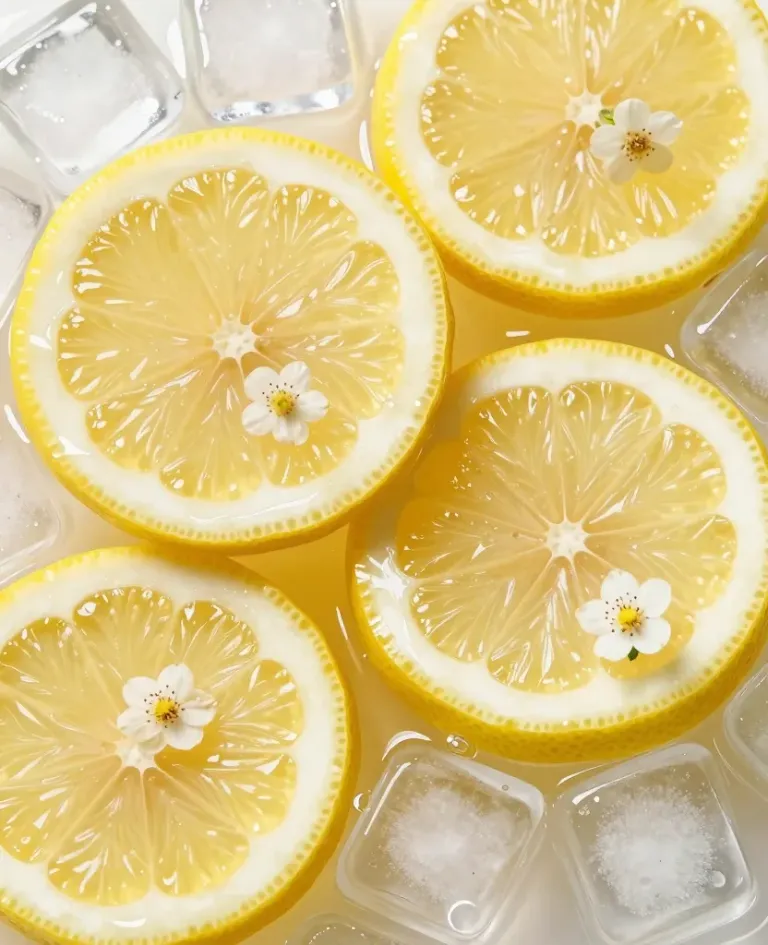 Bright yellow lemons with delicate white flowers and hard, translucent ice cubes, illuminated by diffused, soft light that highlights their textures and colors. The white background and shallow depth of field emphasize the subject, offering ample copy space for design purposes.