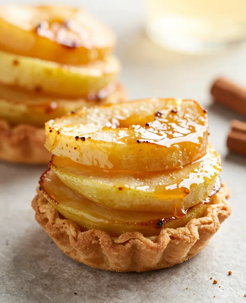 Glossy caramelized apple slices with slight char are stacked in crisp fluted pastry shells, showcasing a warm golden hue and sticky texture. Soft directional lighting from the upper left creates gentle highlights and shallow depth of field, with a neutral textured background providing clean copy space.