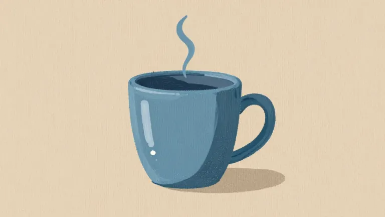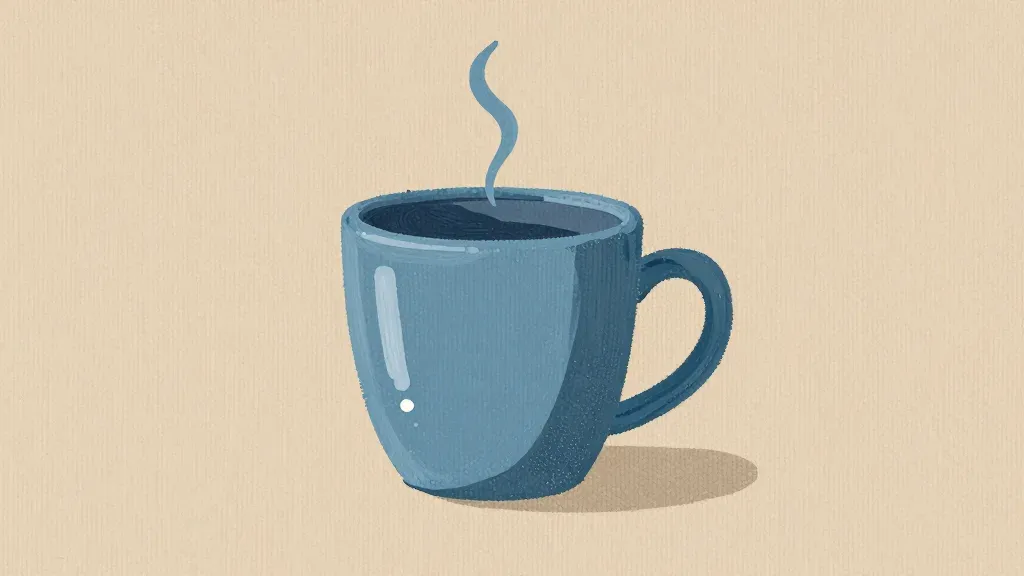 A glossy blue coffee cup with steam rising from it, set against a soft, diffused light that creates gentle highlights and shadows, creating a balanced and symmetrical composition with a plain beige background.