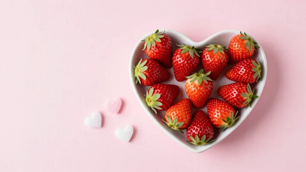 Smooth, glossy strawberries fill a heart-shaped bowl against a soft pink background, illuminated by diffused light that highlights their vibrant texture. The clean, minimal background and centered composition make this image ideal for food and valentine's day themes.