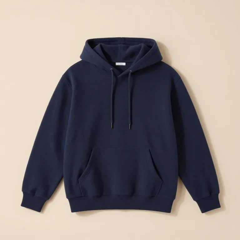 A neatly folded navy blue hoodie with soft, slightly textured fabric and smooth drawstrings, displayed against a neutral beige background. The subtle, even lighting highlights the fabric's texture and the hoodie's folds, creating a clean and minimal composition.