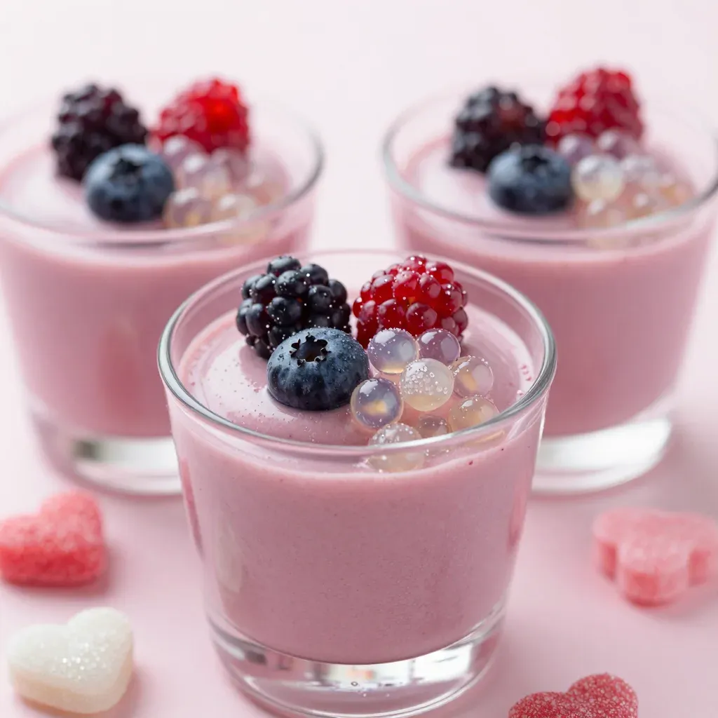 Three glass cups filled with smooth pink berry mousse are garnished with plump blackberries, blueberries, raspberries, and translucent tapioca pearls, creating a vibrant and appetizing dessert presentation. Soft front-lit diffused lighting enhances the glossy textures of the berries and glass rims, while a shallow depth of field isolates the central cup against a clean off-white background with scattered heart-shaped sugar candies.