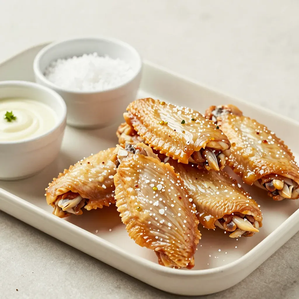 Golden-brown chicken wings coated in a glossy caramelized sauce, sprinkled with coarse salt and vibrant herbs, presented on a white plate with a creamy dip and salt in the background. The soft, diffused lighting highlights the textures and glossy sauce, creating a clean and minimalistic composition.
