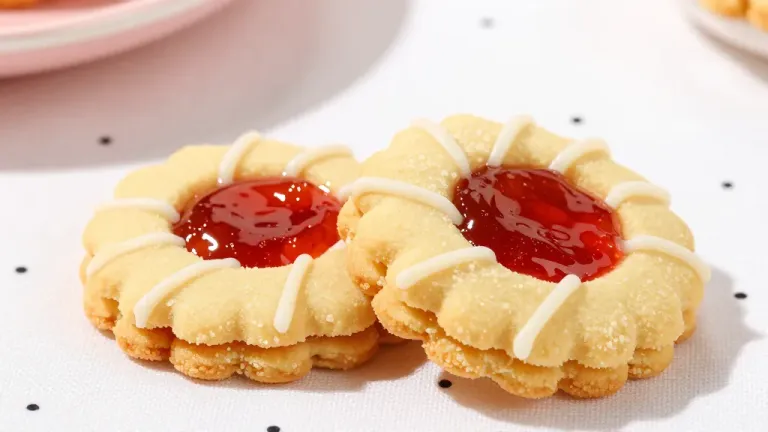 Two golden-brown thumbprint cookies feature glossy crimson cherry jam centers and delicate white icing drizzle, with fine sugar crystals glistening on the fluted edges. Soft directional lighting from the upper left creates gentle highlights and shallow depth of field emphasizes texture against a clean polka-dotted background.