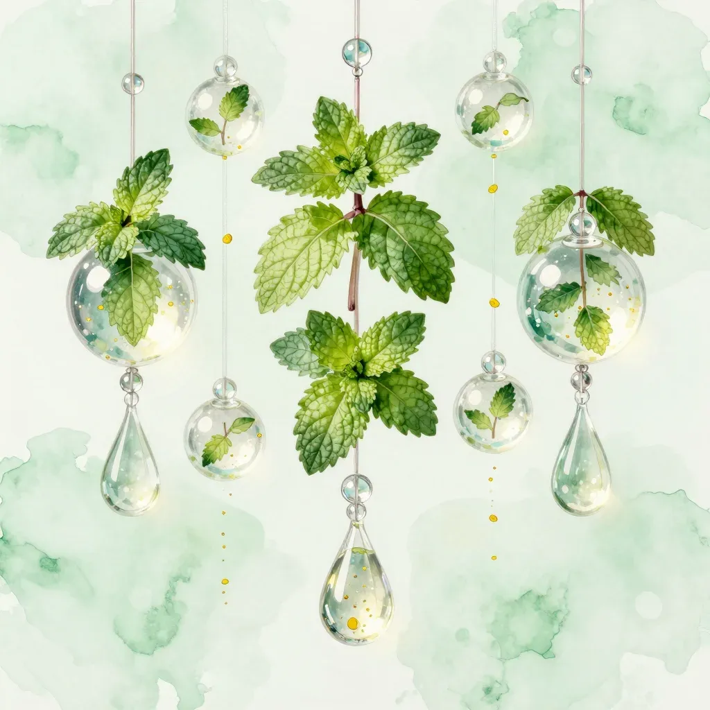 Glossy mint leaves suspended in clear glass orbs, illuminated by soft, diffused light that highlights their vibrant green texture and the clarity of the orbs. The balanced arrangement and watercolor background create a harmonious and flowing composition.