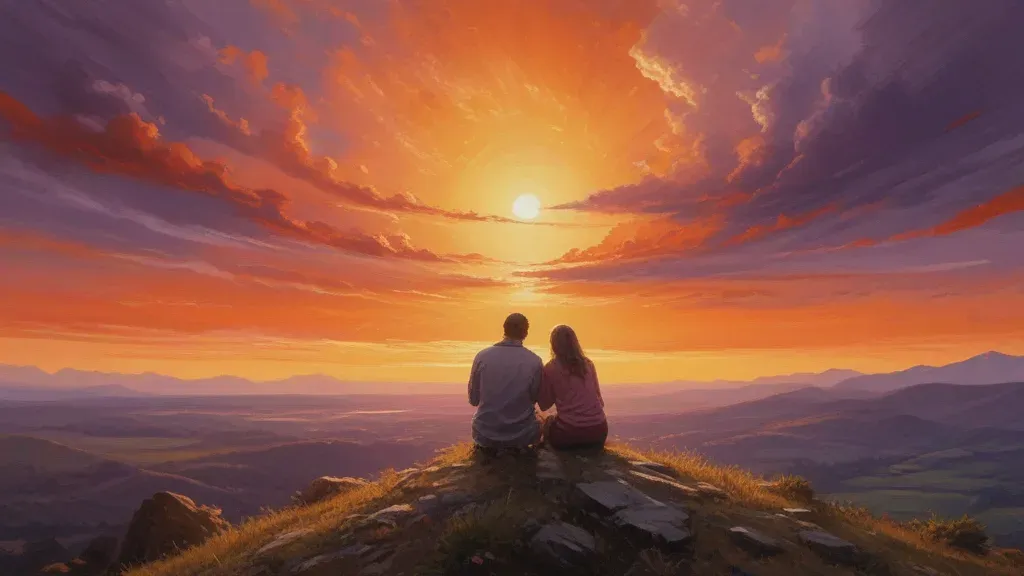 Four figures stand on a grassy summit, gazing at a vibrant sunset, with warm golden sunlight casting soft shadows. The wide-angle shot emphasizes the vastness of the landscape and the figures in the foreground, with a slightly blurred background of distant mountains and a vast sky.
