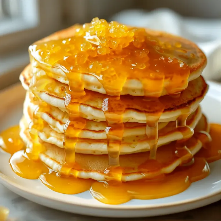 A stack of fluffy pancakes is generously topped with a glossy, bright orange marmalade glaze, creating a warm, inviting scene. The warm, ambient light highlights the texture and glossy sheen of the marmalade, emphasizing the height and freshness of the pancakes.