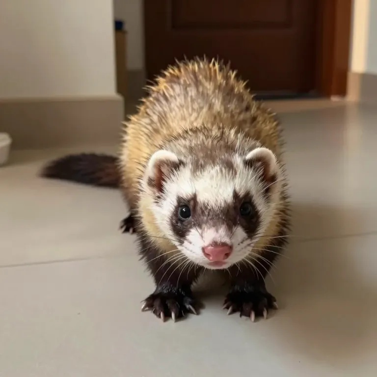 A ferret stands on its hind legs, showcasing its glossy fur and delicate whiskers, illuminated by warm indoor light that highlights its features. The shallow depth of field blurs the background, focusing attention on the subject.