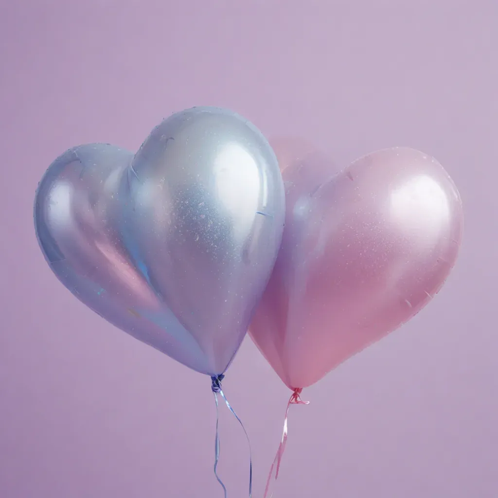 Two heart-shaped balloons, one silver and one pink, float gracefully against a soft lavender background. The silver balloon reflects light, creating a shimmering effect, while the pink balloon has a soft, matte finish. The diffused lighting highlights the balloons and casts gentle shadows, enhancing their three-dimensional appearance.