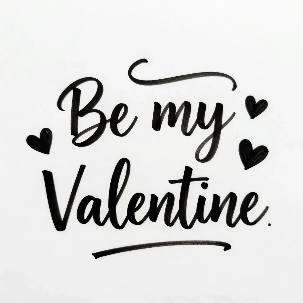 The phrase 'Be my Valentine' is elegantly written in glossy black ink on a smooth white paper, with two decorative hearts flanking the text. Soft, diffused lighting creates subtle shadows, enhancing the romantic and minimalist composition.