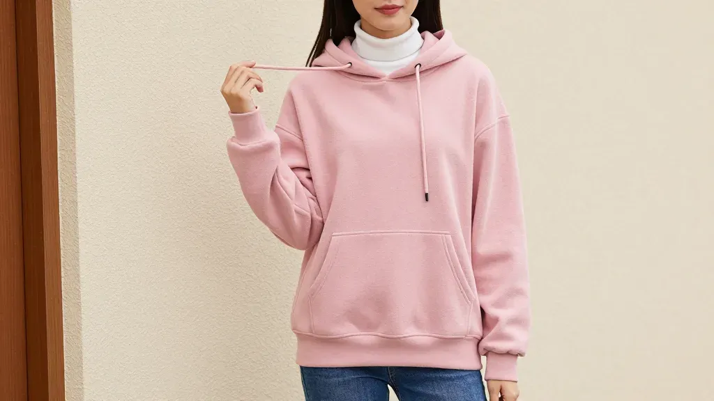 A person models a soft, plush pink hoodie over a white turtleneck, with even diffused lighting highlighting the fabric's texture. The neutral beige background provides a clean and simple backdrop, emphasizing the outfit's details.