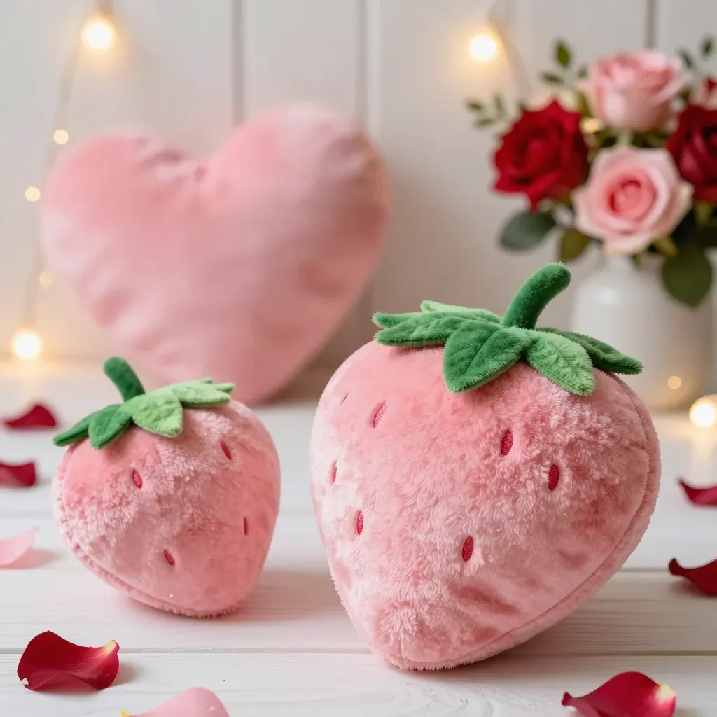 Two plush strawberry cushions with glossy texture and soft velvety material, gently lit to create a warm and inviting atmosphere. The composition is centered with the cushions in the foreground and a blurred background of roses and rose petals, providing ample copy space for design elements.