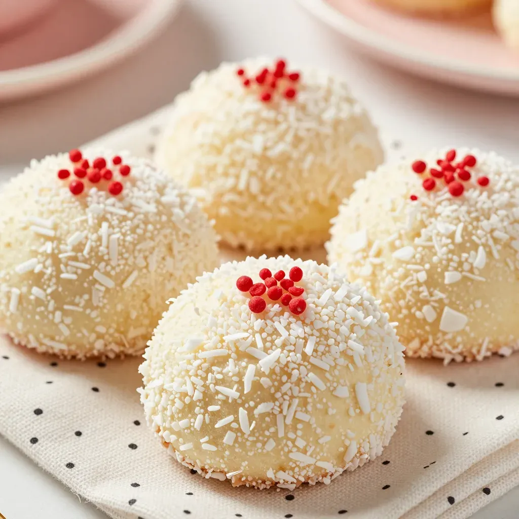 Close-up of glossy white coconut-snowball cookies adorned with red and white sprinkles, softly lit to highlight their texture and vibrant colors. The shallow depth of field blurs the background, focusing attention on the cookies.