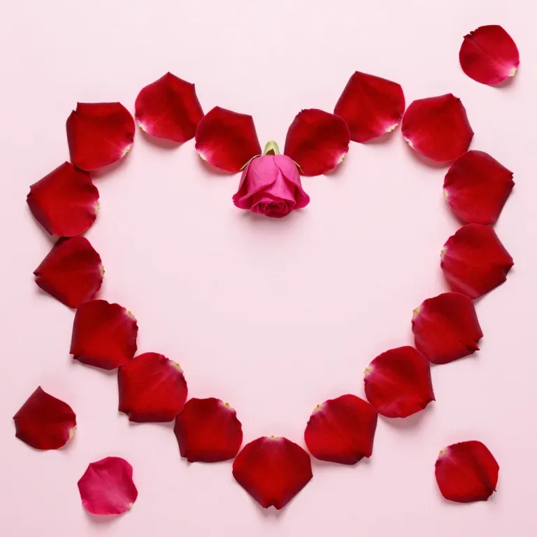A symmetrical arrangement of glossy, velvety rose petals forming a heart shape, with a soft pink rose at the center, illuminated by diffused light that creates gentle shadows and highlights. The plain white background enhances the vibrant red and pink hues, providing ample copy space for text or branding.
