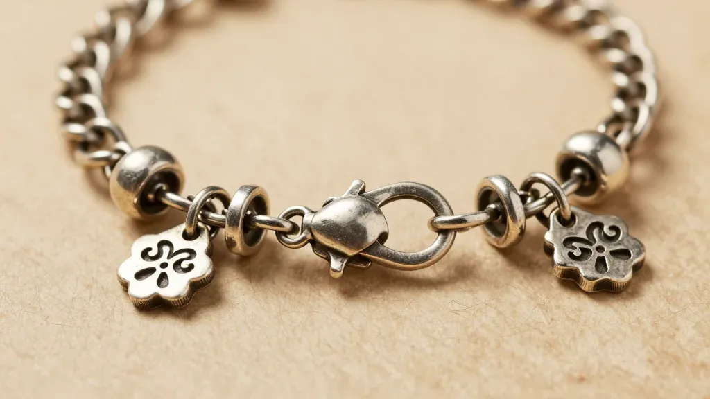 A close-up of a polished metal charm bracelet, highlighting its reflective surface and intricate charms against a warm beige background. The soft, diffused lighting emphasizes the bracelet's texture and the subtle details of the charms, creating a sense of elegance and sophistication.
