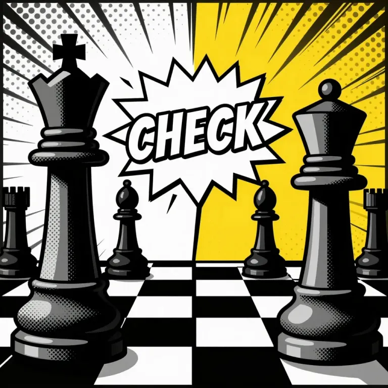 A glossy black chess king is dramatically posed in a checkmate stance, with bold 'CHECK' text emphasizing the action. The high-contrast lighting and comic book aesthetic create a striking visual effect, ideal for game promotion or strategic concepts.