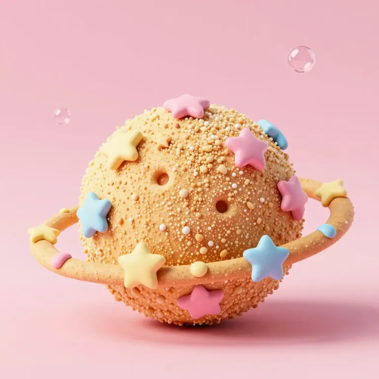 A golden crumb cookie shaped like a planet, adorned with pastel-colored stars, bathed in soft, diffused light that creates gentle highlights and shadows, set against a uniform pastel pink background that emphasizes the cookie planet's dynamic tilt and vibrant details.