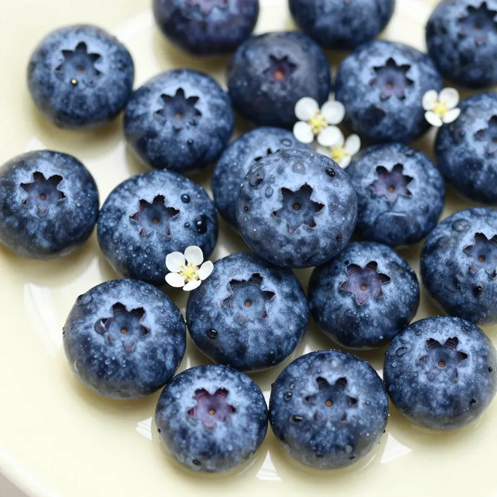 Glossy blueberries with a delicate white flower, softly lit from above, creating a serene and inviting composition. The pale yellow background enhances the vibrant colors and textures of the berries and flower, providing a clean and minimalistic backdrop.
