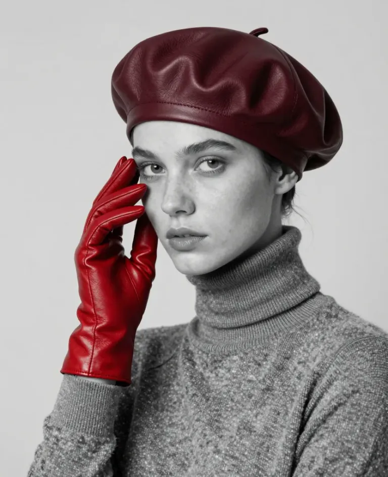 A model wearing a burgundy leather beret and a gray turtleneck sweater, with a red leather glove, set against a soft, diffused light that highlights the textures of the leather and fabric, creating a balanced and symmetrical composition with a plain light gray background.