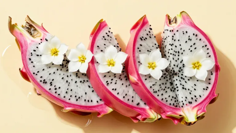 Dragonfruit slices arranged in a circular pattern with white flowers, showcasing smooth, creamy white flesh and vibrant pink rinds under soft, diffused lighting that enhances texture and depth. The neutral, light beige background allows the dragonfruit to stand out without distraction.